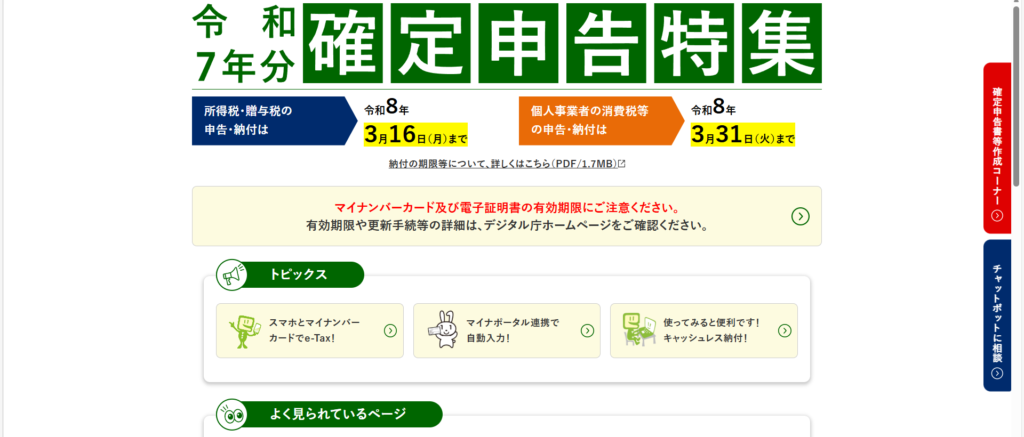 ここは確定申告の紹介ページみたいです。右にある赤いタブを押すと入力場所に飛びます。