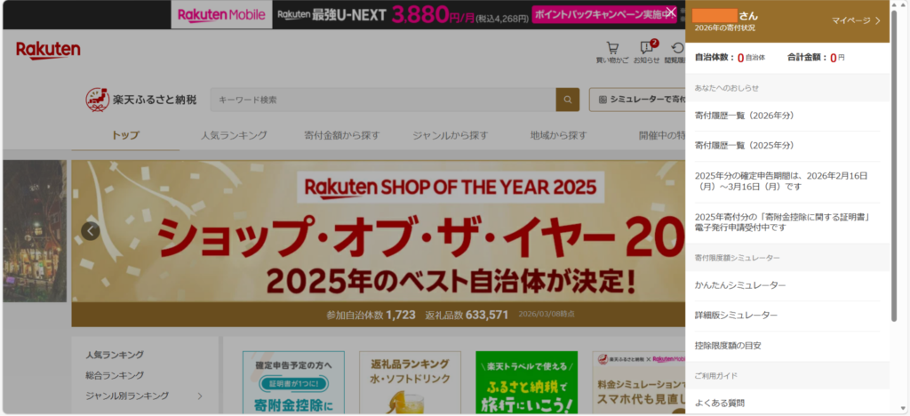 出てきた画面で寄付金一覧の下にある、「2026年度分」って所をクリックしてするとリストが出て来ます。
