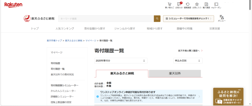 リストから2024年度分をクリックすると、昨年分の楽天ふるさと納税の履歴が確認出来ます。