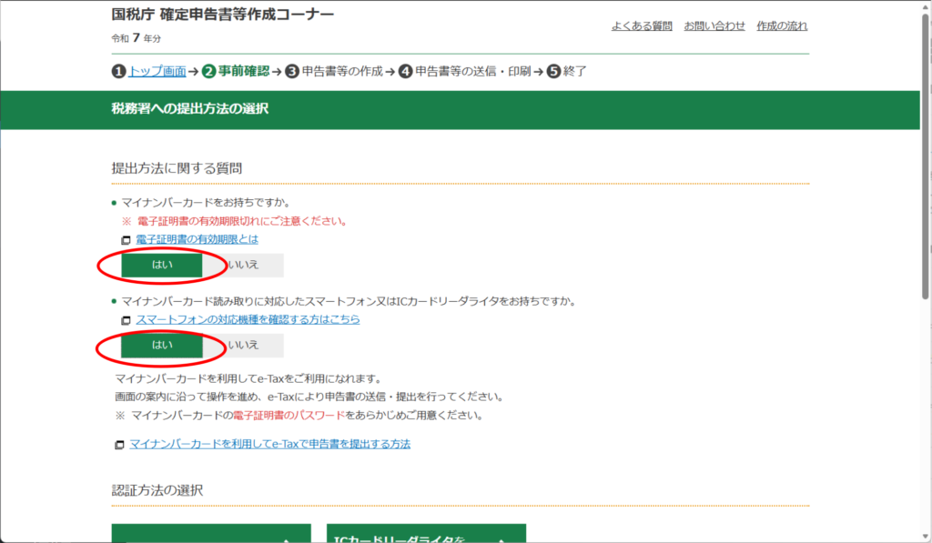 <マイナンバーカードを持っているか?>で「はい」を選択すると、下に開いて、<マイナンバーカードの読み取りに対応したスマホは持っているか?>で「はい」を選択すると、下に開きます。