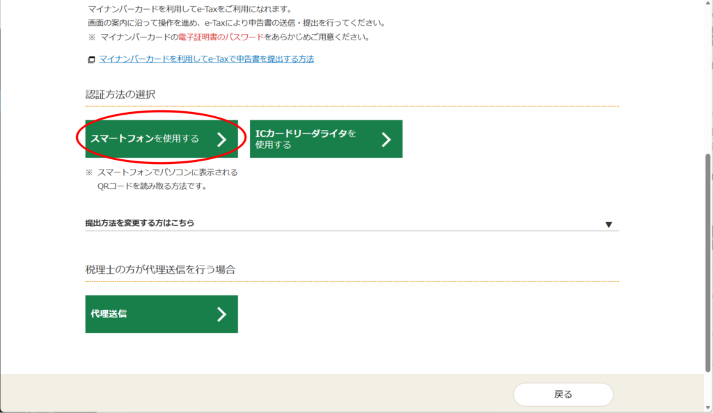 下の方に下がって行き、<認証方法の選択>が出てくるので、「スマートフォンを使用する」のボタンを押します。