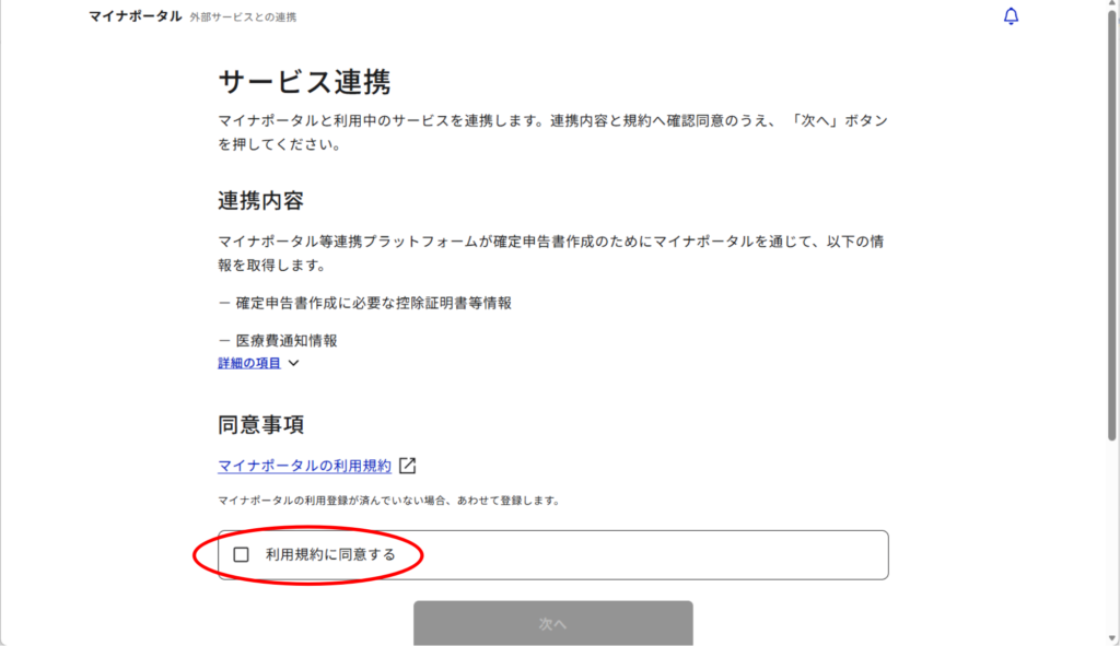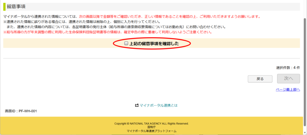 「上記の留意事項を確認した」にチェックを入れると、右下の「次へ」が押せるようになります。