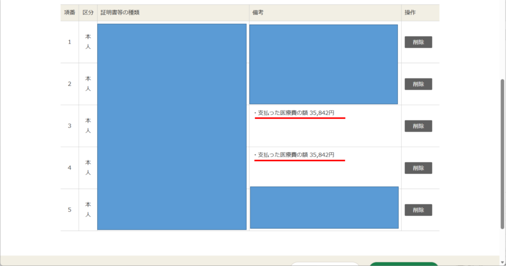 僕の様にダブってしまった場合は、右の「削除」をクリックすると消せます。よく確認したら、下にある。「申告書等を作成する」をクリックします。