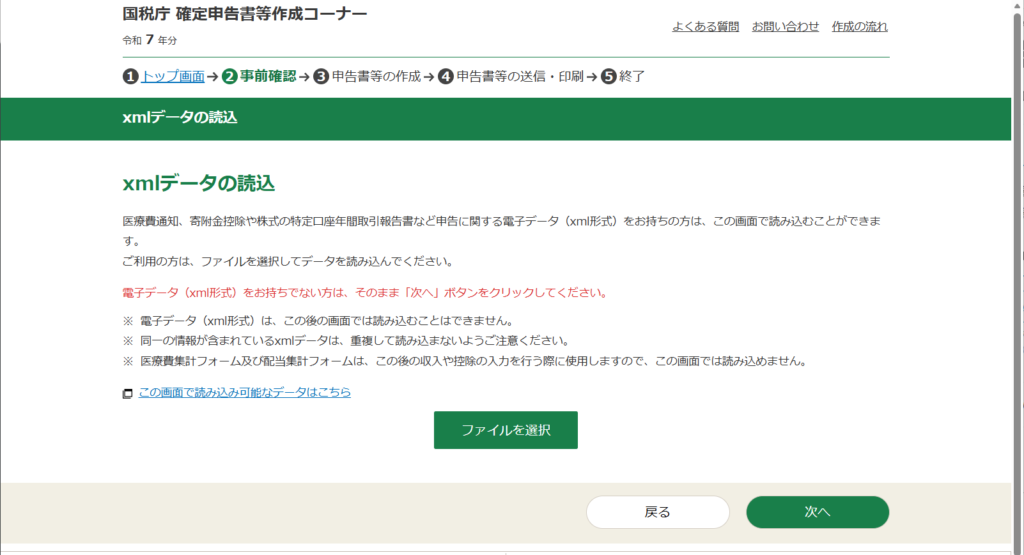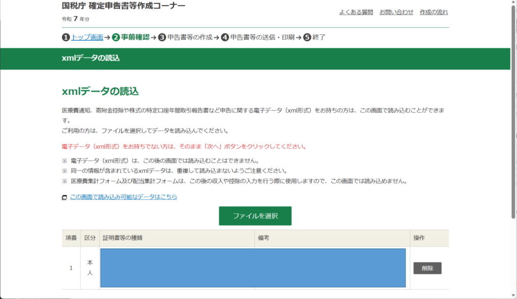 確定申告の画面に戻ってきて、次はマイナポータルの連携以外の情報を取り込みます。