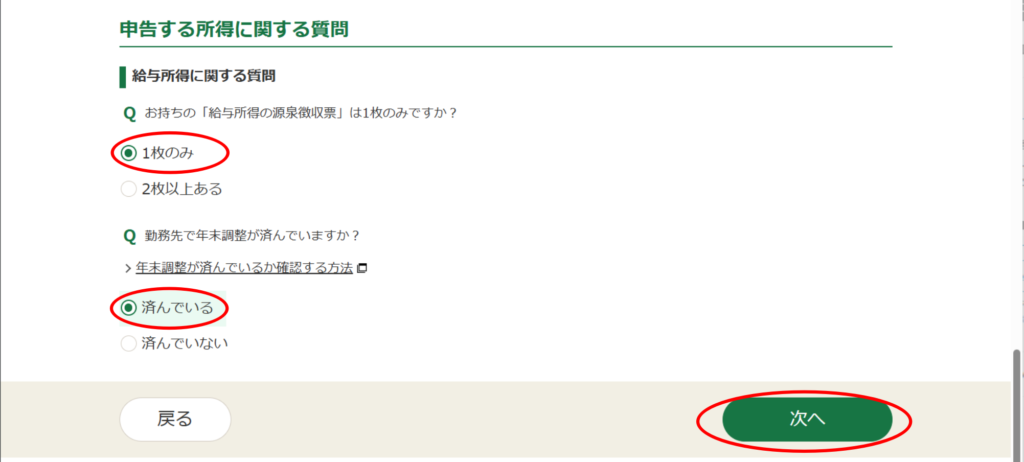 見ての通り、源泉徴収票が1枚かどうか?と、年末調整の有無ですね。それぞれチェックを入れたら、「次へ」で進みます。