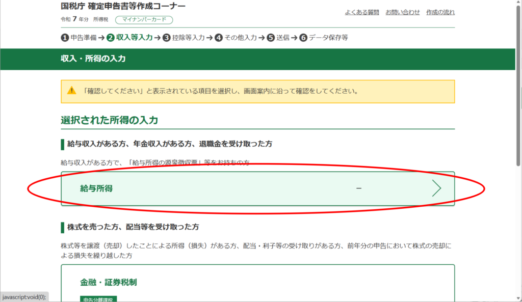 源泉徴収票を手に、給与所得を入力していきます。「給与所得」をクリックしていきます。