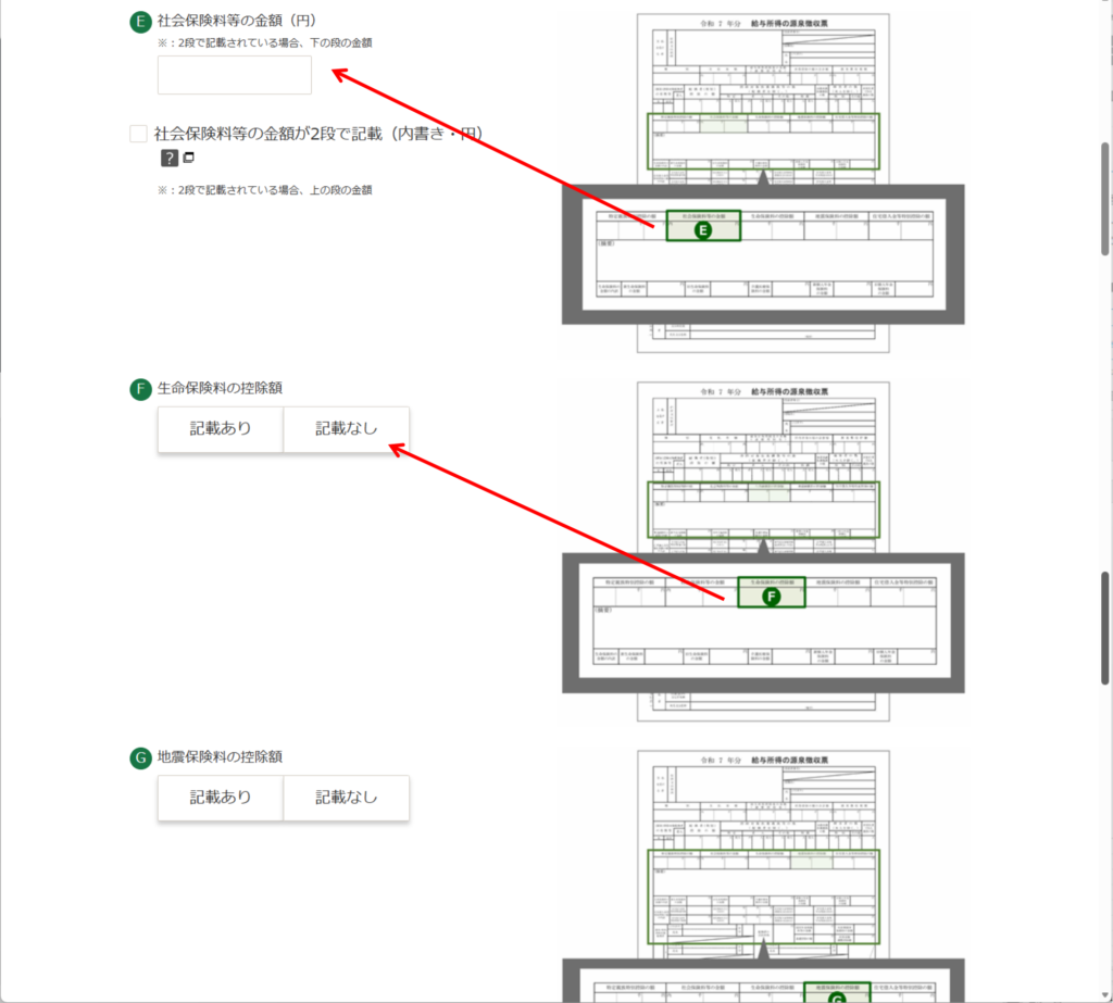 G 地震保険料の控除額・・・対象の場所をよく見て入力しましょう。