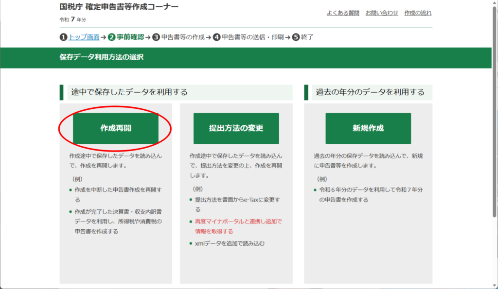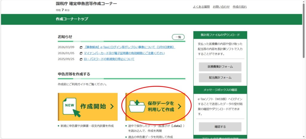 まずは、国税庁のホームページの「令和7年分 確定申告特集」のページの右にある赤タブをクリックします。そうすると下の画面になるので、「保存データを利用して作成」をクリックします。