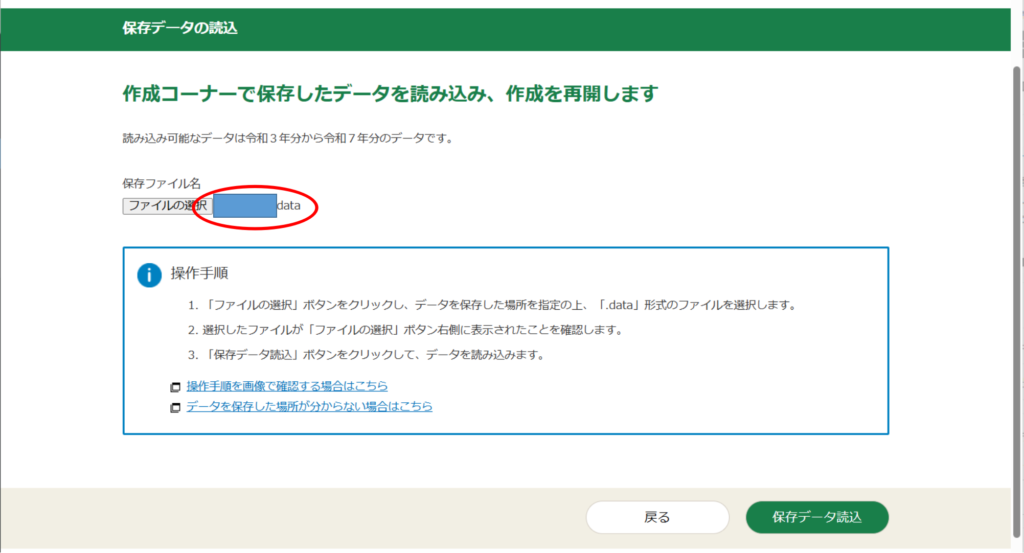 差がわかりにくいのですが、「ファイルの選択」の右側にファイル名が出てます。ちゃんと読み込めたら、右下の「保存データ読込」をクリック