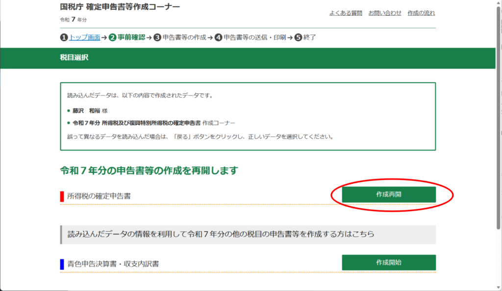 所得税の確定申告 右側にある、「作成再開」をクリック