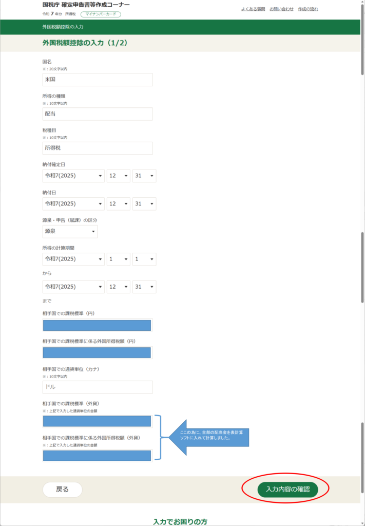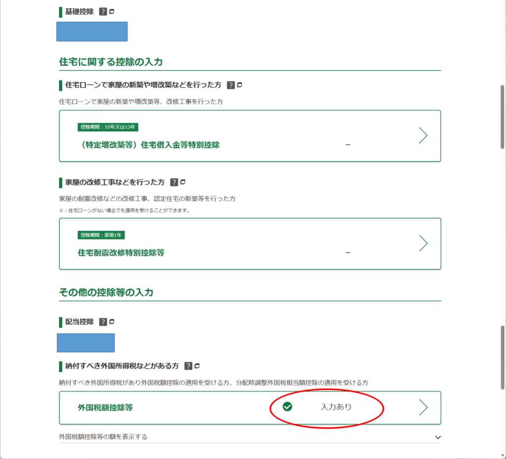 ・外国税額控除は僕が必死に入力した項目で、「入力あり」になってます。