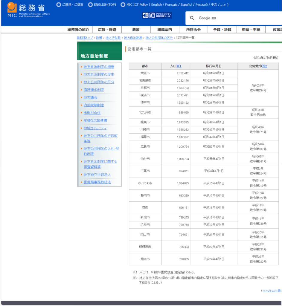 次の「政令指定都市」か、「一般市」か?ですが、下記リンクで総務省の一覧が見れます。