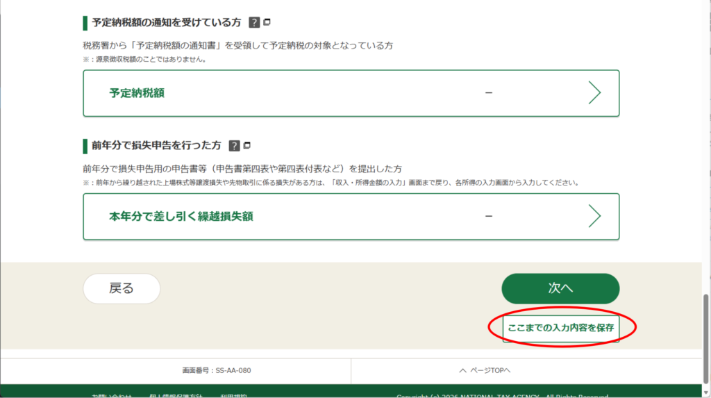 僕はちょっと疲れたので、いったん休憩します。「ここまでの入力内容を保存」をクリック。