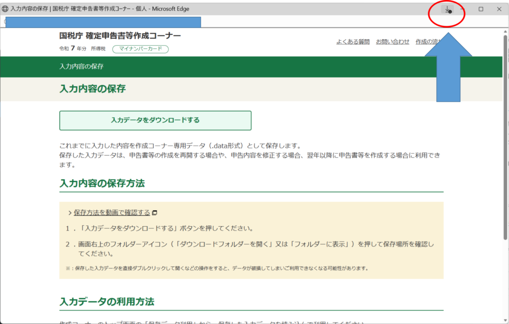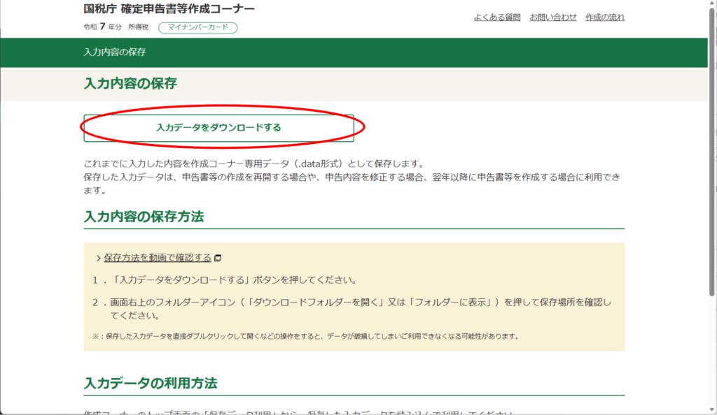 入力内容の保存で、「入力データをダウンロードする」をクリックします。