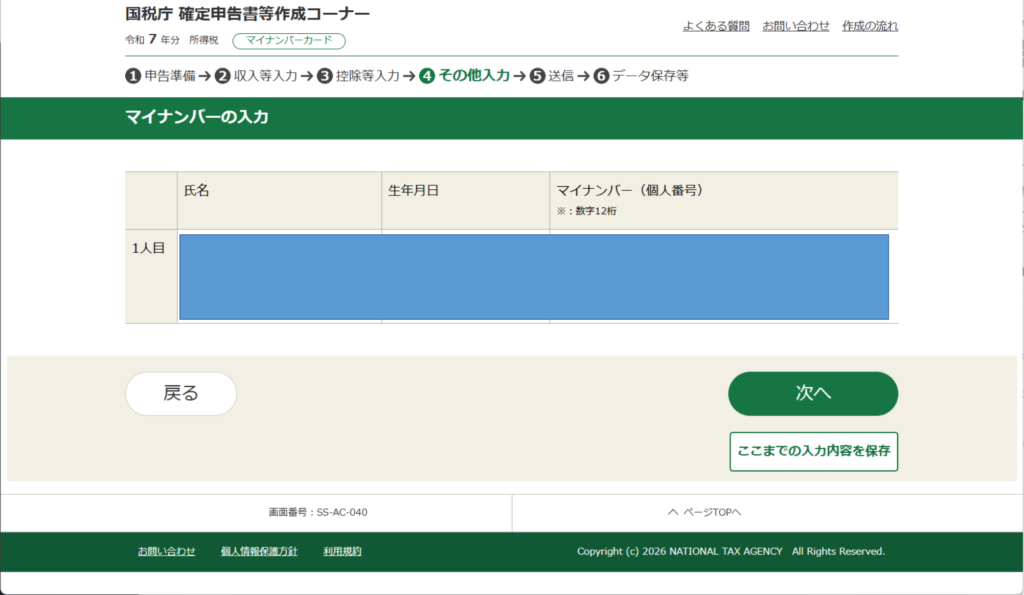 マイナンバーの入力画面になります。「いまさら?」って思ってしまったのは僕だけでしょうか?