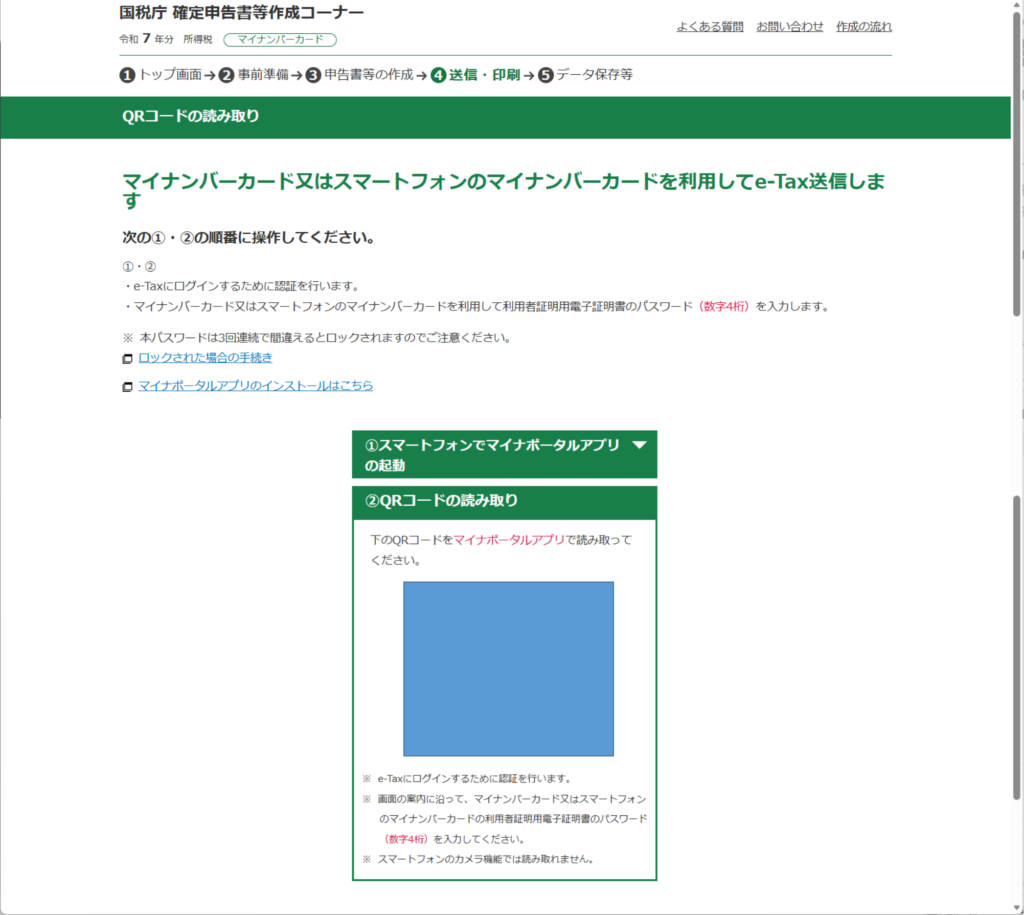 QRコードを読み取る画面がでるので、スマートフォンでマイナポータルアプリを開き、そこからQRコードを読み取ります。