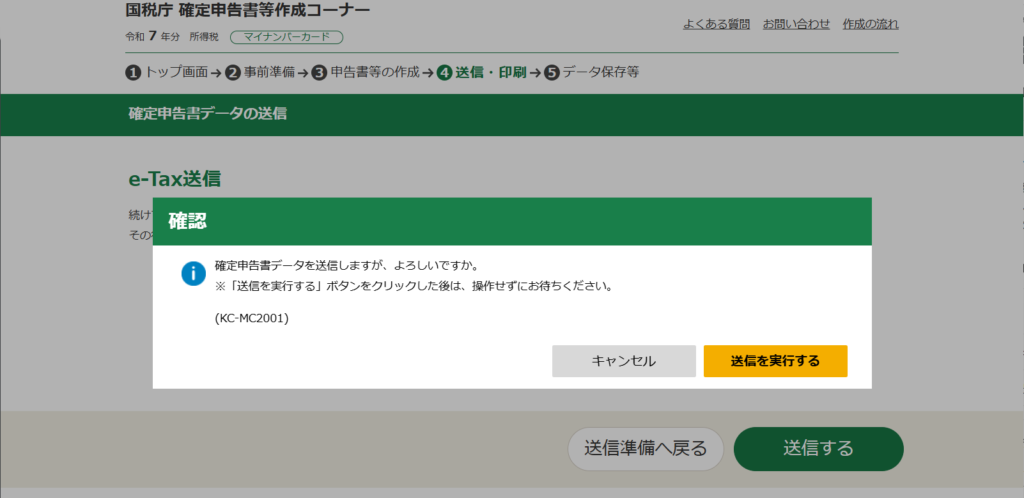 「送信を実行する」をクリックすると、送信画面が出てきて、完了すると、下記画面が出ます。