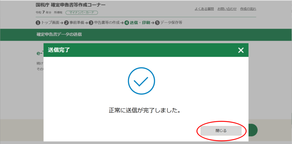 「閉じる」をクリックすると、「送信完了」画面が消えますが、左上の更新マークが地味に回っていて、ページが変わるので、そのまま待機します。送信完了すると、「送信結果の確認」画面に移行します。