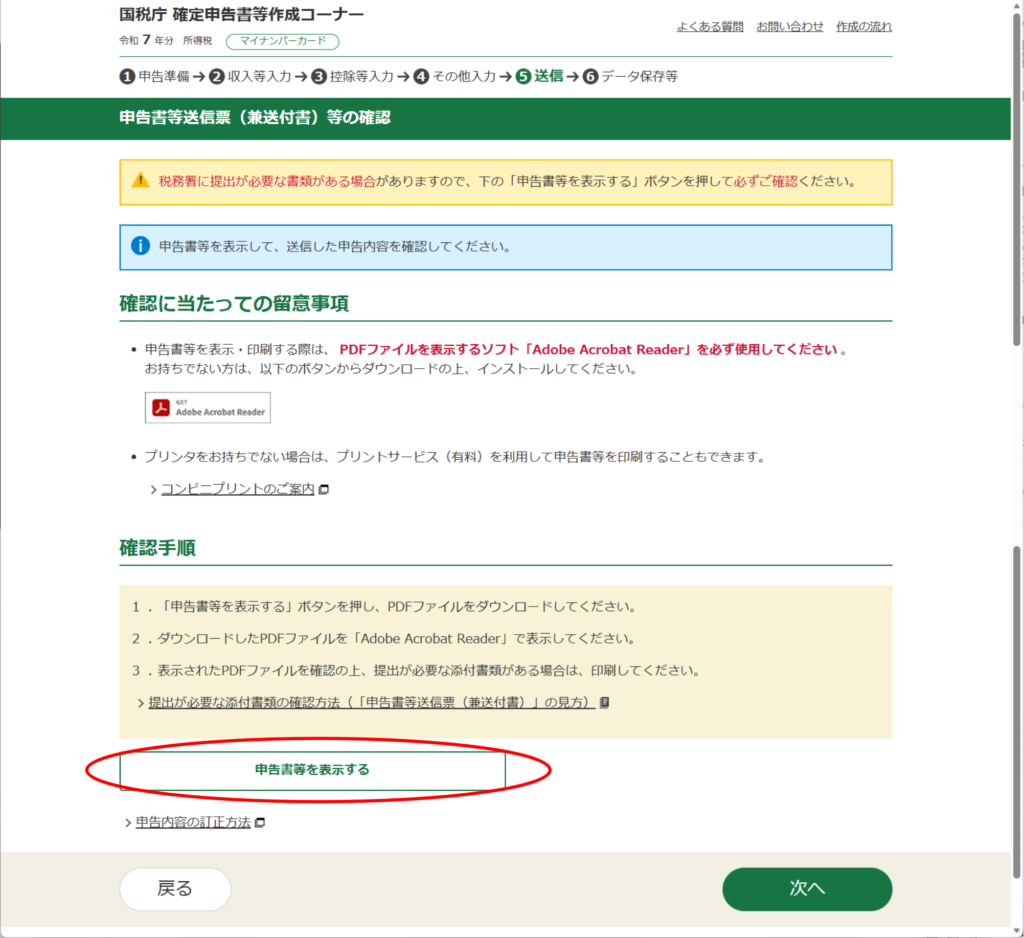 以前に見た事ある画面に戻った感じがしますが進んでます。「申告書等を表示する」をクリックして、ダウンロードを待ちます。