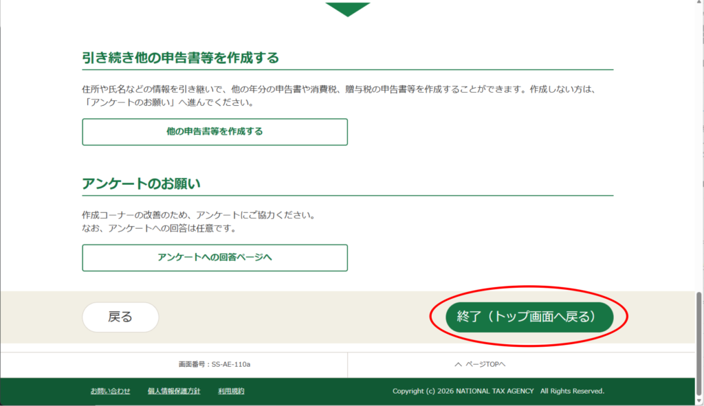 「終了(トップ画面へ戻る)」をクリック