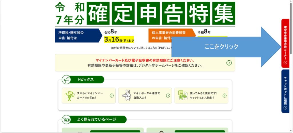国税庁のホームページの「令和7年分 確定申告特集」のページの右にある赤タブをクリックします。