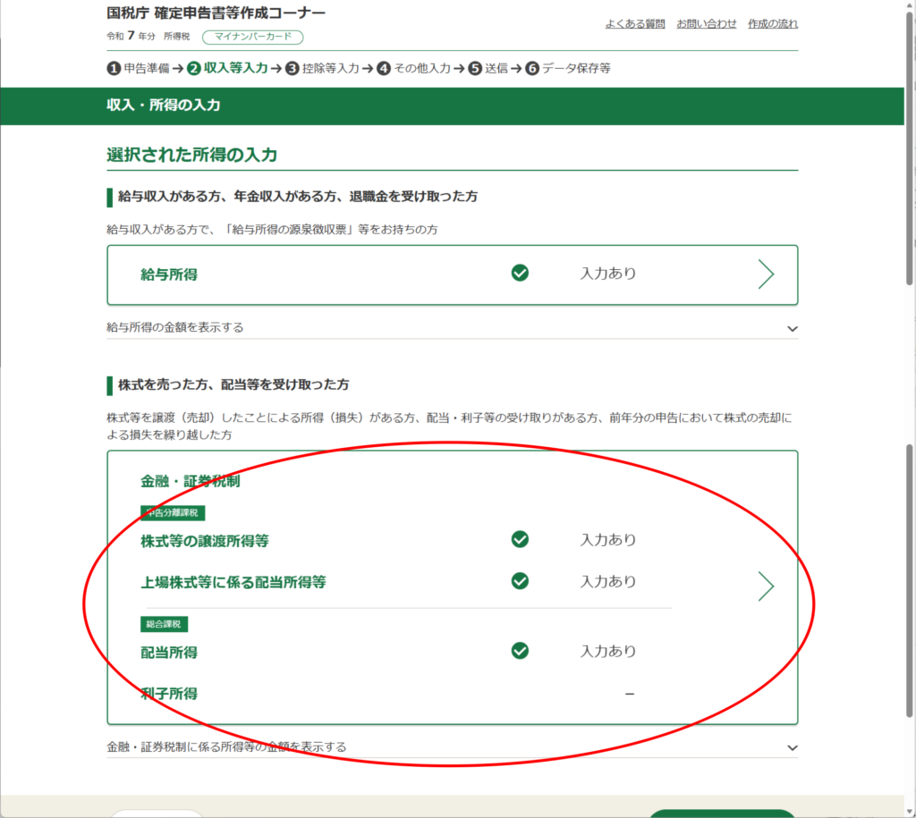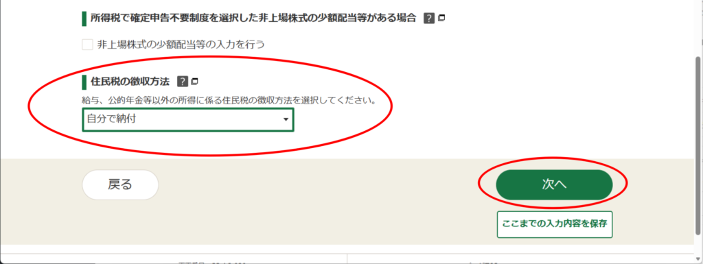 下の方にある「次へ」で進めますが、金額等、納得いかなかった場合は、だいぶ戻って「総合課税」としていた場合、「申告分離課税」に変更して確認してみてもいいかもです。