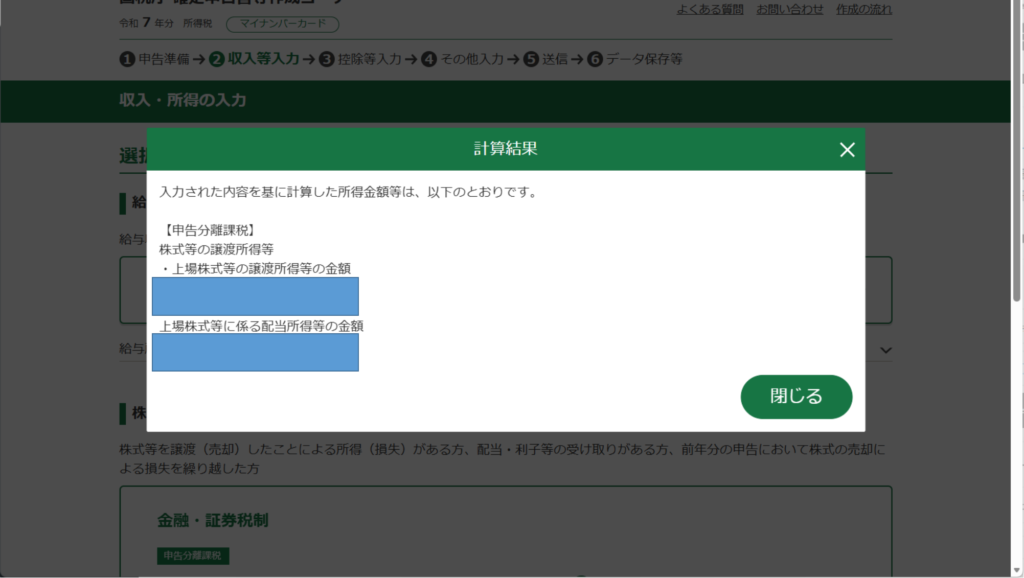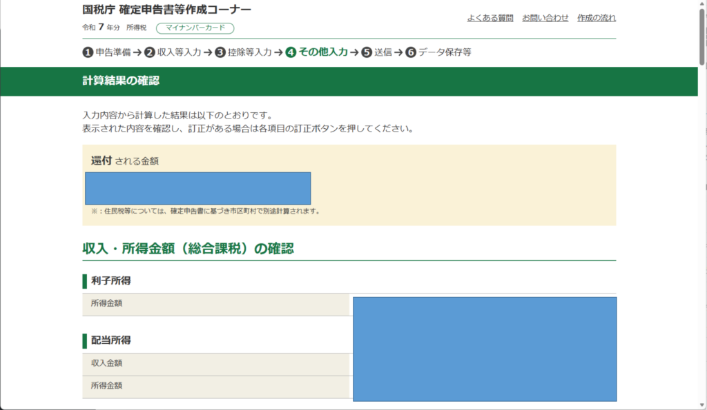 「閉じる」をクリックして、「次へ」を3回クリックすると、再度、「計算結果の確認」画面にたどり着き、僕の場合ですと、還付金が出ましたが、総合課税の方が金額が多かったです。